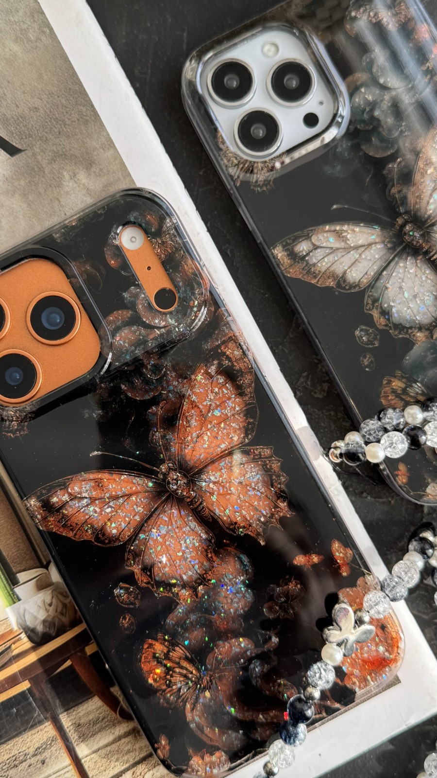 قاب موبایل آیفون پروانه ترنسپرنت مشکی پولکی طلایی