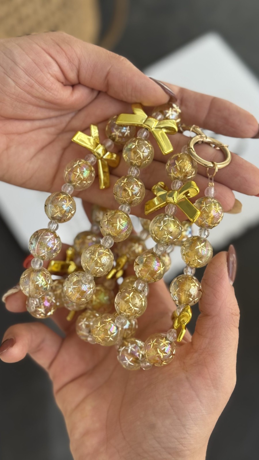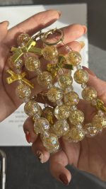 این آویز موبایل شامپاینی از متریال باکیفیت ساخته شده که دوام بالا و ماندگاری رنگ فوقالعادهای دارد. مهرههای طلایی-شفاف آن دارای افکت براق و انعکاس نور هستند و در نور طبیعی جلوهای درخشانتر پیدا میکنند. پاپیونهای طلایی نیز جلوهای لوکس و خاص به آن میبخشند.