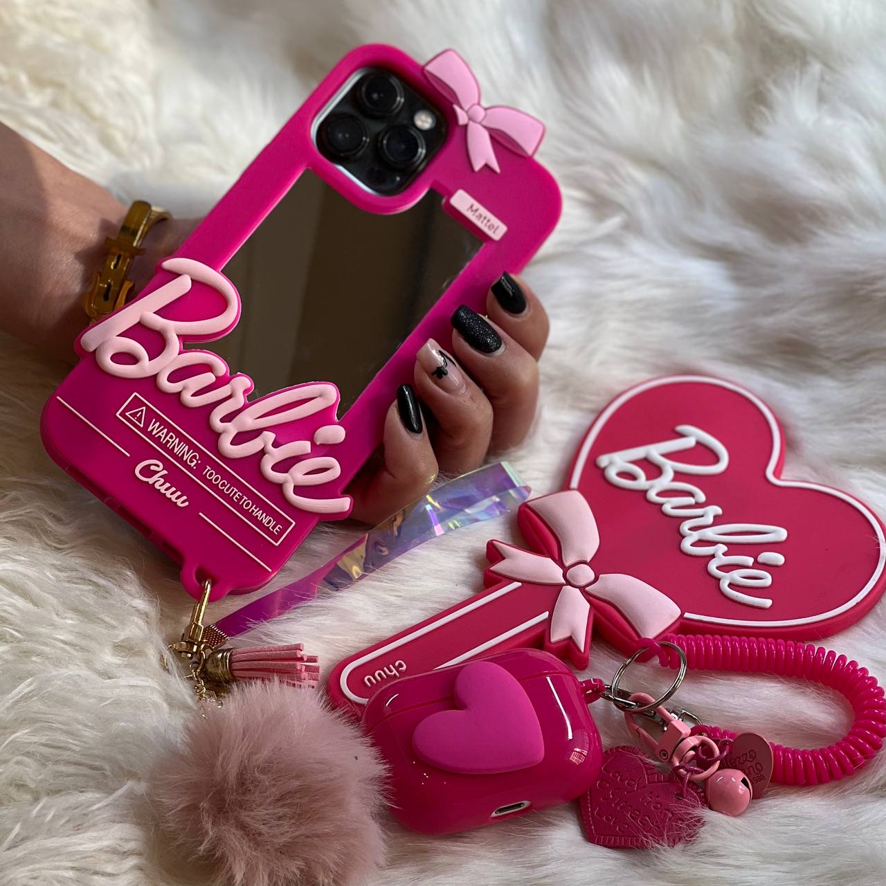 قاب موبایل آیفون باربی نوستالژی آیینه ای صورتی + آویز ست
