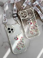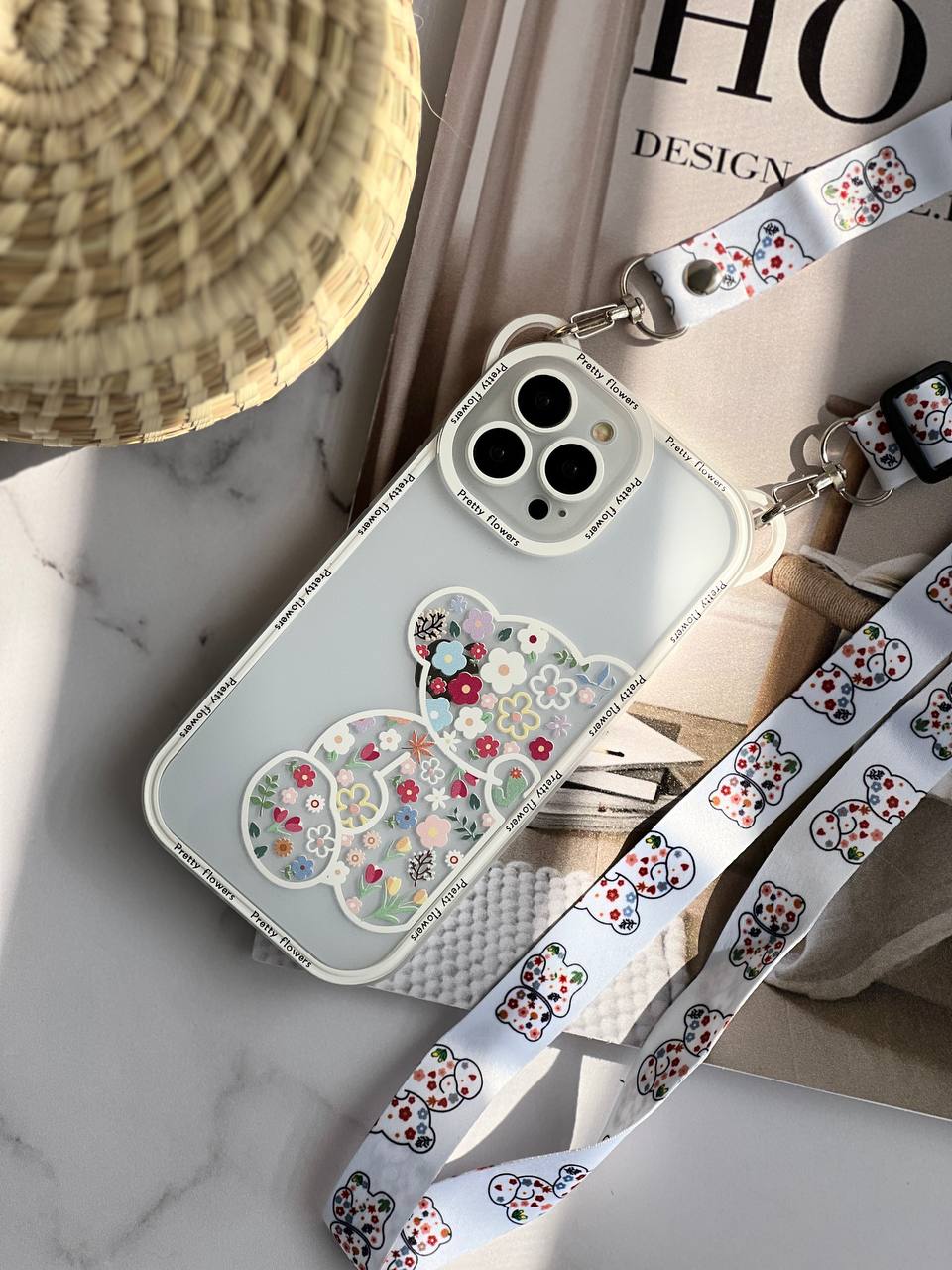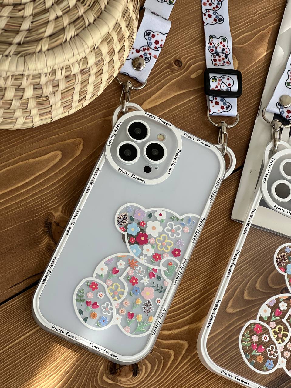 قاب موبایل آیفون خرس بهاری گوش دار پشت بیرنگ + بند آویز بلند