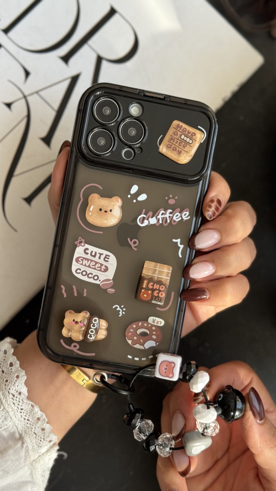 تصاویر برجسته خرس شیرین، بسته شکلات، نوشته کافی، دونات و جزئیات کارتونی، همگی با متریال مقاوم و با کیفیت ساخته شدهاند. این عناصر نهتنها جذابیت بصری قاب را چند برابر میکنند، بلکه حس لمس و سهبعدی آن را بسیار جالب میسازند. رنگبندی قهوهای–صورتی قاب باعث ایجاد یک استایل گرم، لطیف و بسیار دلنشین میشود که کاملاً مناسب دختران نوجوان و جوان است.