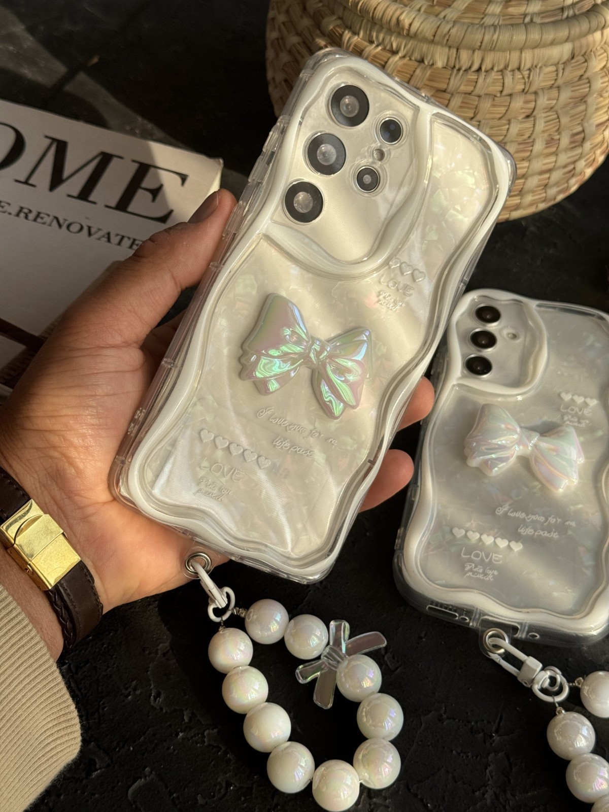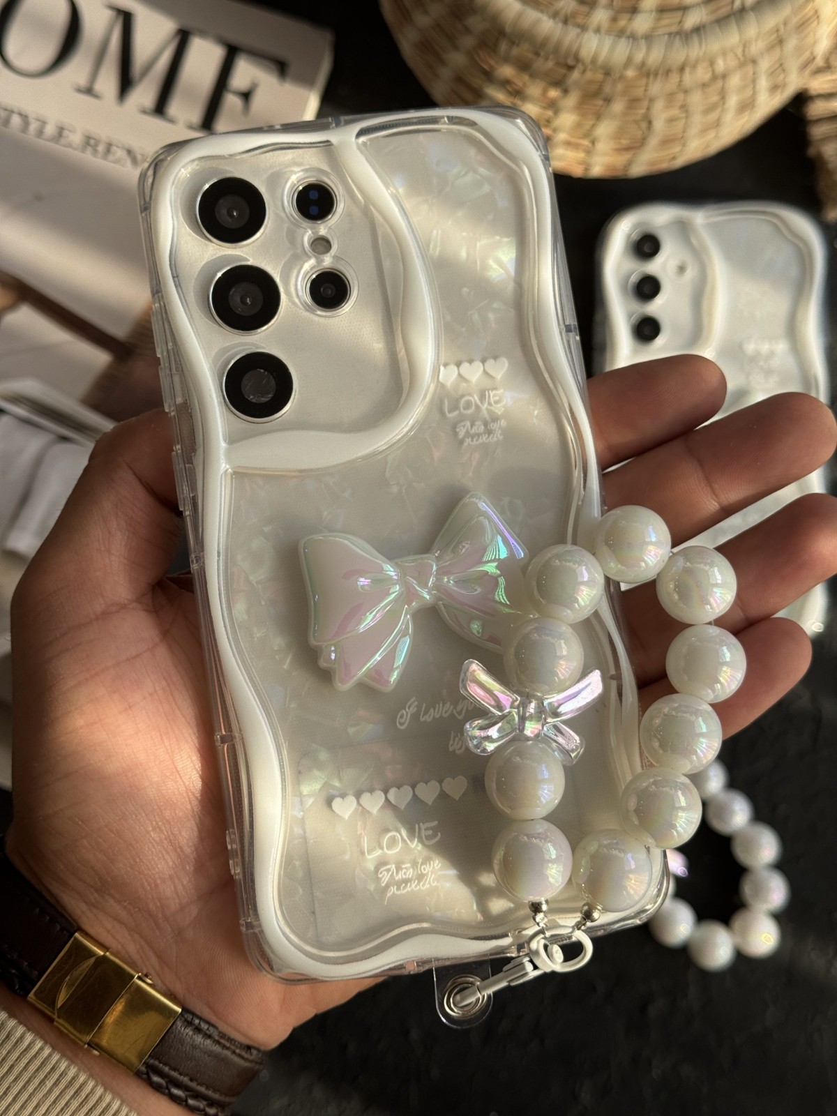 این قاب نه تنها از نظر ظاهری خیرهکننده است، بلکه کیفیت بالایی هم دارد. جنس مقاوم آن از گوشی شما در برابر ضربههای روزمره، خطوخش و گرد و غبار محافظت میکند. بندست مرواریدی براق که همراه قاب ارائه میشود، علاوه بر زیبایی و تکمیل استایل فانتزی، کاربردی نیز هست و به شما این امکان را میدهد که گوشی خود را راحتتر در دست بگیرید یا حتی بهصورت دستی و استایلی حمل کنید.