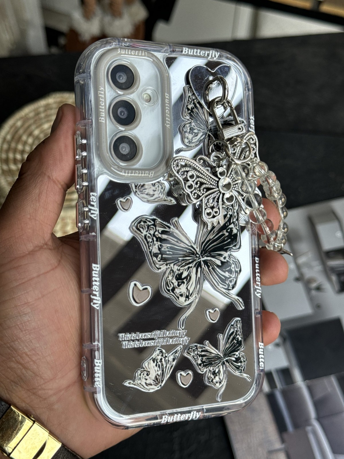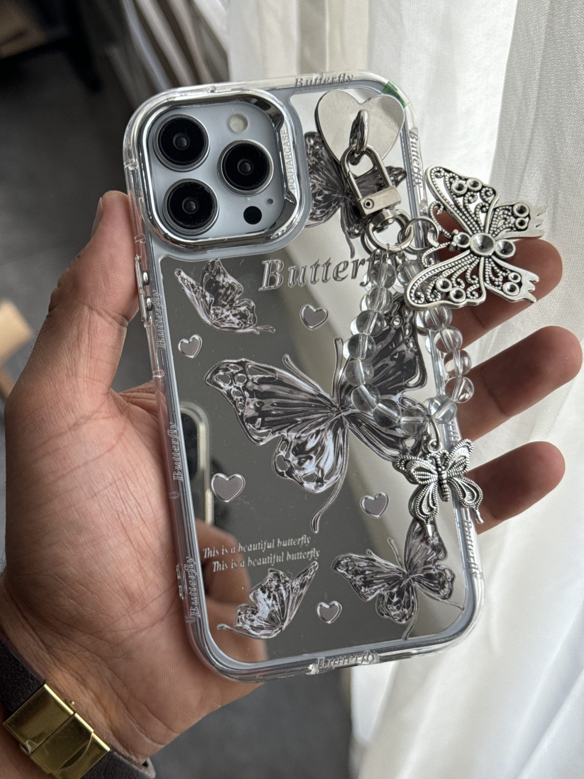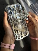 قاب موبایل آیفون سامسونگ پروانه و قلب آیینه ای آویز دار برای افرادی طراحی شده که عاشق استایلهای فانتزی، لطیف و درخشان هستند. ترکیب پروانهها با قلبهای نقرهای، نمایی لطیف و جذاب ایجاد کرده که بهراحتی با استایل روزمره یا حتی مجلسی هماهنگ میشود.
