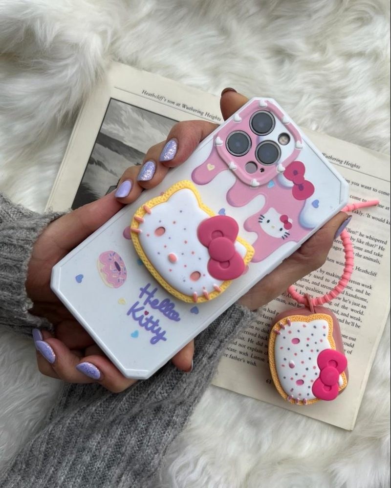 قاب موبایل آیفون هلوکیتی سفید صورتی + پاپ سوکت