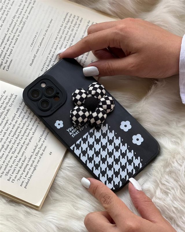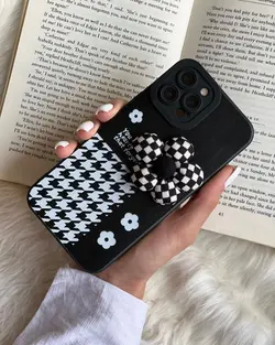 قاب موبایل آیفون گل شطرنجی بالشتی سیاه و سفید