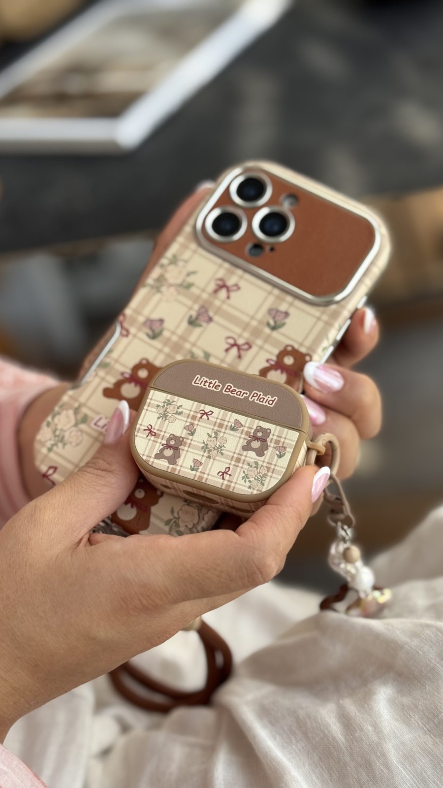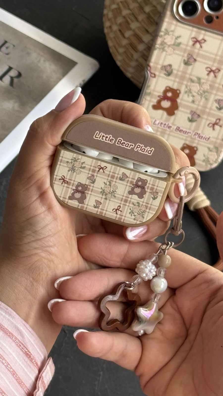 یکی از ویژگی‌های برجسته این محصول، ترکیب زیبایی و کارایی است. طرح شطرنجی (Plaid) به همراه خرس‌های کوچک و روبان‌های قرمز روی کاور، یک استایل دخترانه و دلنشین ایجاد می‌کند. آویز ست موجود نیز شامل مهره‌ها و آویزهای ستاره‌ای شکل است که جلوه‌ای خاص به کاور می‌بخشد و آن را برای هدیه دادن نیز بسیار مناسب می‌کند.