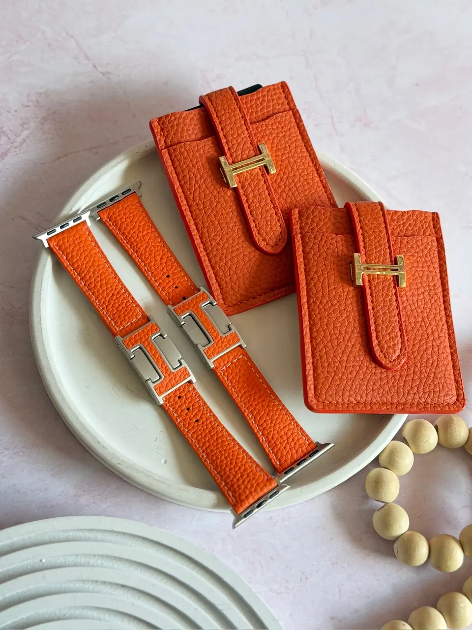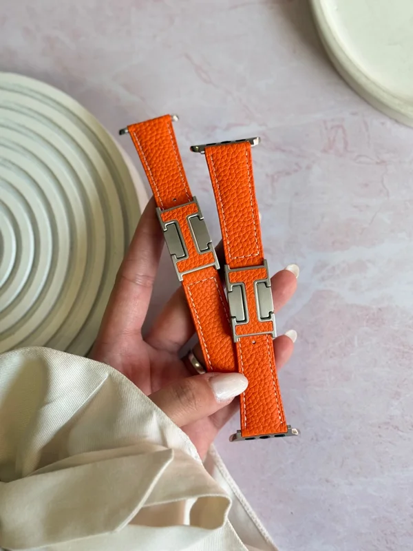 بند اپل واچ چرمی هرمس نارنجی با قفل طرح هرمس (کدw5075)